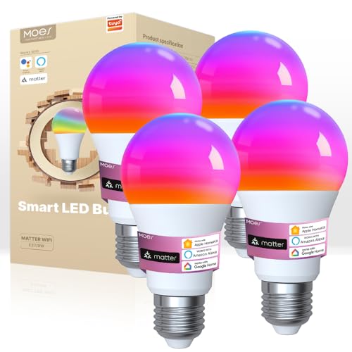 MOES Bombilla Led e27 Inteligent Wifi y Matter 9w RGB 2700K-6500K 806lm Regulable Calida/Blanco Frio ASPECTOS CLAVE o MOES Smart Wifi LED Lamp 9w RGB, Compatible Con Alexa/Google Home, Apple HomeKit, Smart Things 4PCS ASPECTOS CLAVE