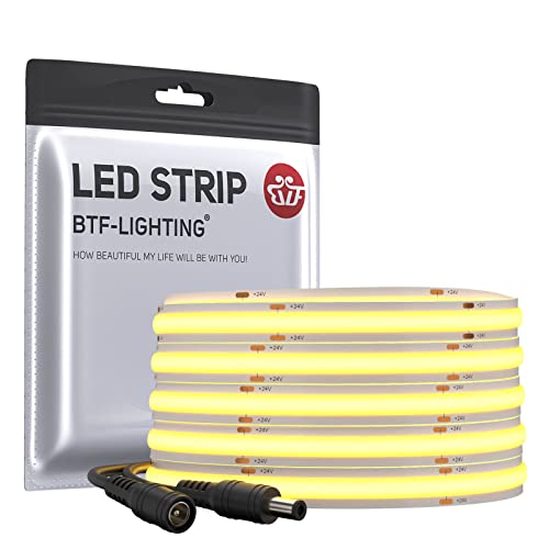 BTF-LIGHTING FCOB COB Tira de LED flexible de alta densidad y uniforme Blanco cálido 3000K 5M 528LEDs DC24V 14W/M CRI 90+ 10mm de ancho Cinta de LED regulable ASPECTOS CLAVE