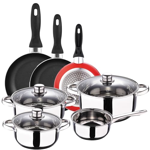 Batería 7 piezas S.Ignacio Cassel y Set 3 sartenes Ø16/Ø20/Ø24 cms rojo, aluminio prensado, antiadherente, inducción ASPECTOS CLAVE